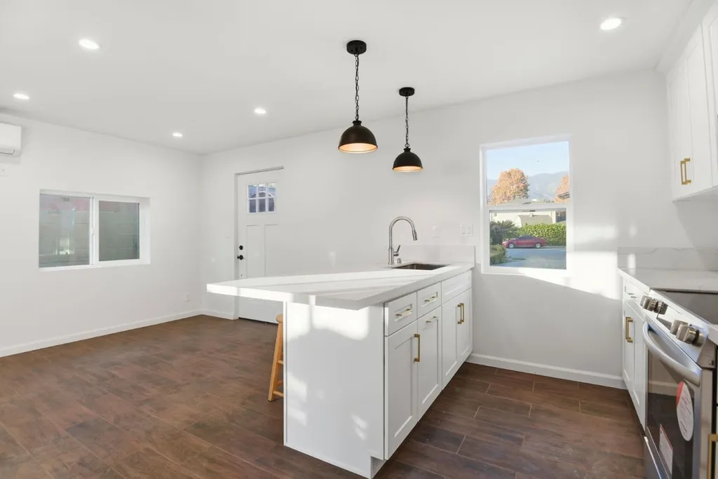 Thoughtful finishes and a clean, modern layout create a composed foundation for daily living in this studio with one bathroom. Recessed lighting, smooth surfaces, and warm-toned flooring give the space a polished, comfortable feel that supports both quiet routines and flexible use. Your main living area flows easily into the kitchen, where shaker-style cabinetry, sleek appliances, and a generous island provide room for everyday cooking, casual dining, or focused work time. The bathroom is finished with a glass-enclosed shower, updated fixtures, and clean-lined cabinetry that keeps the space feeling orderly and refreshed. A dedicated laundry hookup adds practical convenience without interrupting the layout. Neighbors often enjoy walking throughout the area, and nearby streets support an easy, walkable lifestyle. You are close to the charm of Old Town Monrovia, known for its local cafes, restaurants, and weekly street market. Grocery options such as Trader Joes, Vons, and Sprouts Farmers Market are conveniently nearby, while outdoor recreation awaits at Library Park and Monrovia Canyon Park with its scenic trails. Access to the Metro A Line in Monrovia supports straightforward commuting throughout the San Gabriel Valley and into Downtown Los Angeles.
