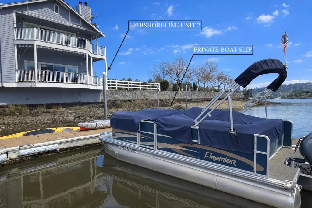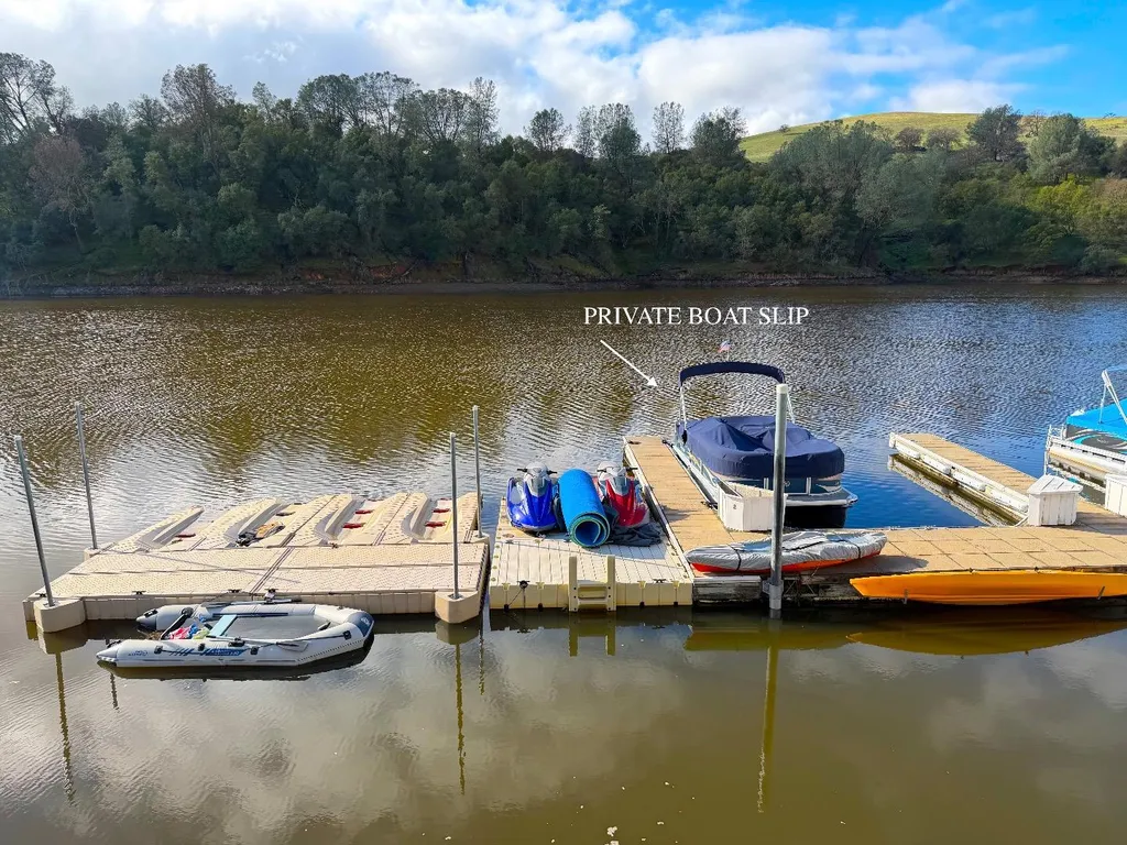 Lakefront, low-maintenance living with your own private boat slip! This 3-bedroom, 2-bath,1,500 sqft ground-level residence showcases the quality and finishes of a former model home, situated in arguably the best location in the community. Step directly out the front door to a spacious, park-like grassy area overlooking Lake Tulloch. Thoughtfully designed with an open, functional floor plan, the home offers comfortable single-level living and exceptional natural flow throughout. Exterior responsibilities are fully managed by the HOA, including maintenance of the roof, siding, paint, decks, landscaping, docks, boat launch, parking areas, and fire insurance coverage. The home comes with both a dedicated carport and an assigned open parking space. Residents enjoy an impressive range of amenities such as tennis, pickleball, and basketball courts, a private boat launch with docks, picnic areas, and designated community parking for boats, RVs, and trailers. Enjoy the convenience of having Drifters Marina right next door for waterfront dining and drinks.The location also provides easy access to wine tasting, charming historic downtowns, outdoor recreation, state parks, and seasonal snow activities along Highways 4 and 108.