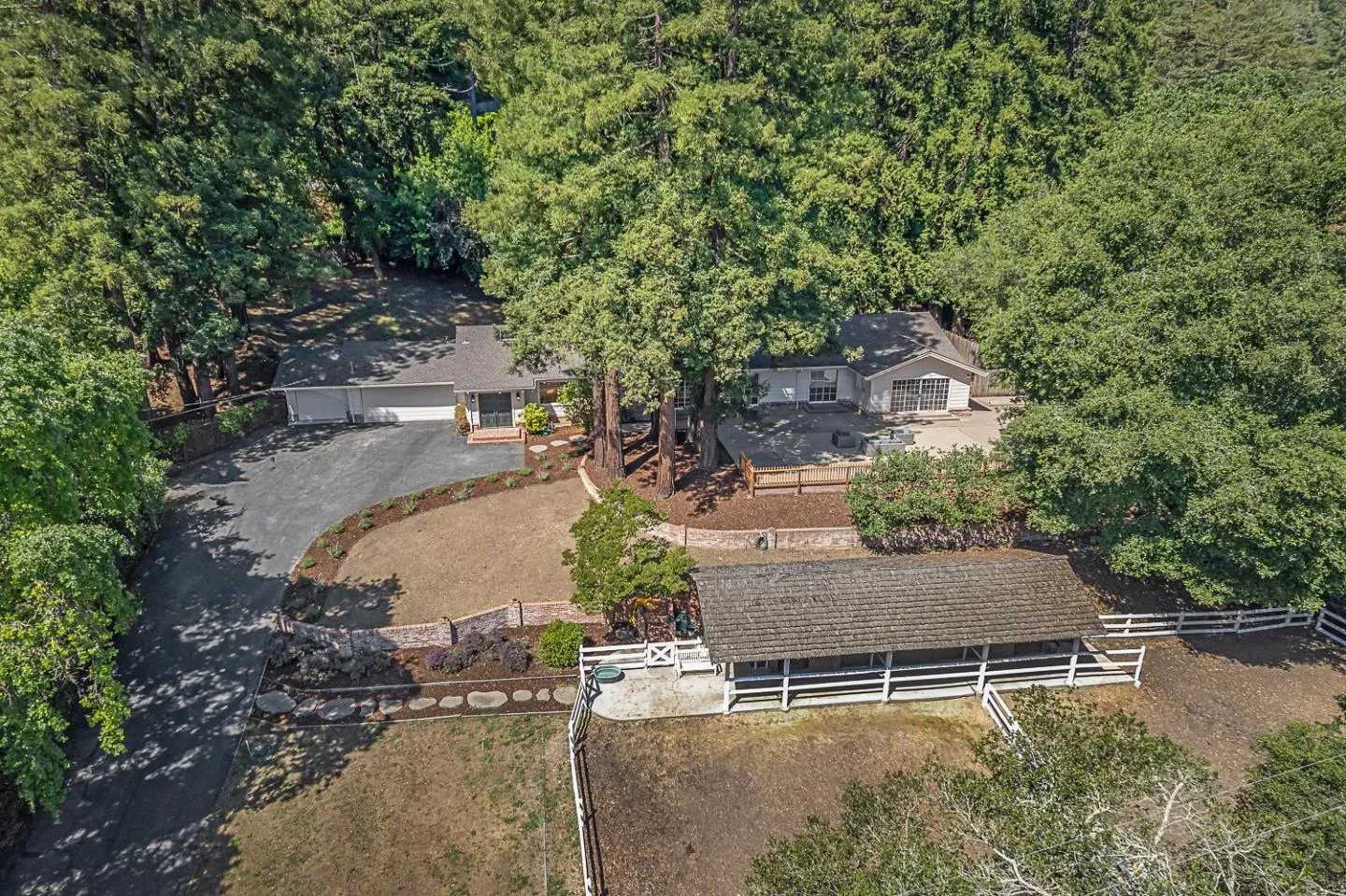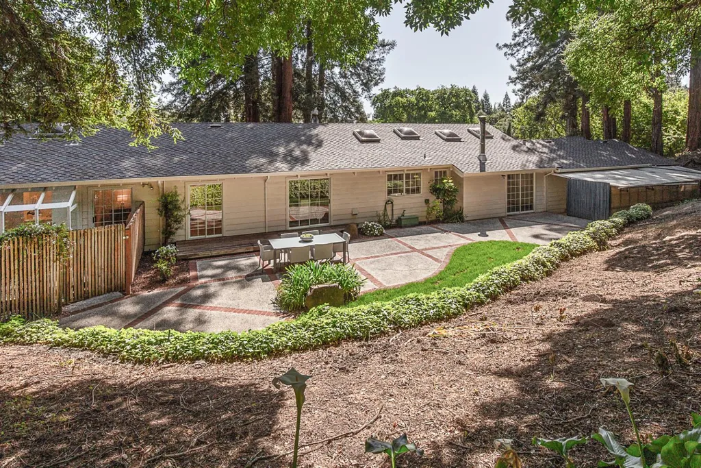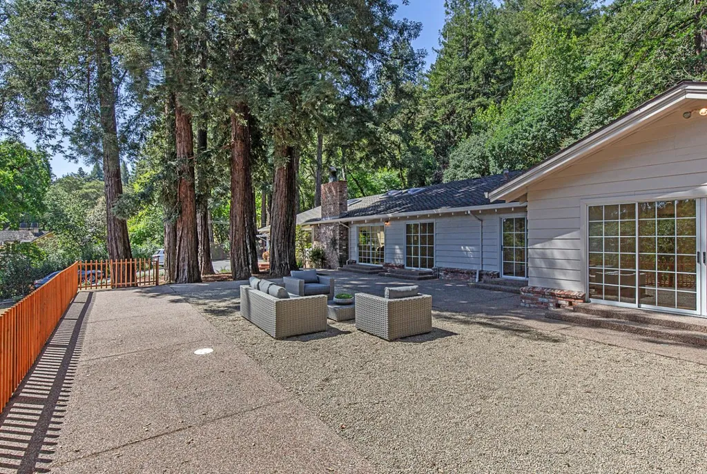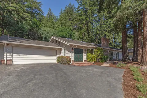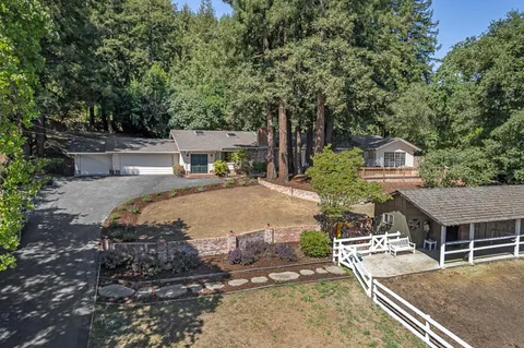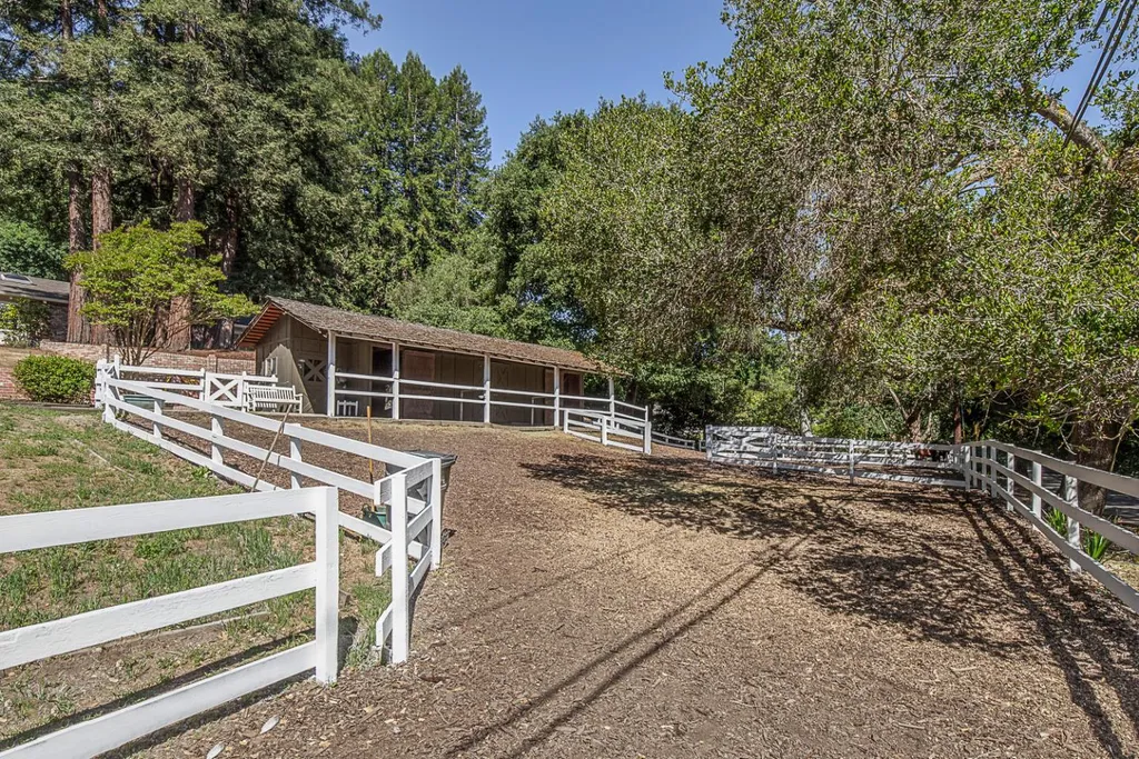 This light-filled country home in the heart of central Woodside, on just over one acre, is privately positioned at the top of a gentle knoll beyond picturesque equestrian facilities. Inside, every room opens to the outdoors through sliding glass doors with views of surrounding redwoods. Formal living room features fireplace & opens to expansive front terrace, while the adjoining formal dining room connects to the rear grounds. Bright & light kitchen with breakfast bar seating opens to the inviting family room with a charming wood stove &access to the rear patio. Separate bedroom wing is arranged for privacy & guest suite with solarium tub that takes full advantage of the redwood views. Luxurious primary suite has access to both front & rear grounds, extensive customized closet space, plus a spa-inspired marble bath with vanities, jetted tub & shower. Equestrian amenities include a 3-stall barn with tack room & white fenced corral amid sun-swept open grounds and perimeter redwoods. An attached 3-car garage & adjoining large covered workshop complete the offering. Located just 1.5 miles from Woodside town center and with access to acclaimed Woodside School, this is a special opportunity to enjoy the best of country living in a premier location.
